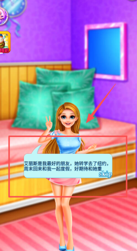 3、在金发女孩的卧室中,可以点蓝色对话框右侧的skip跳过聊天,或者欣赏房间的背景布置,体验沉浸感。