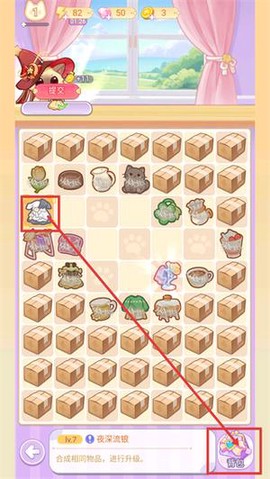 3、当你进入睡衣派对关卡时,通过合成相同的物品来进行升级,这样还可以通过点击背包按钮来管理已有的道具,助力你的通关。